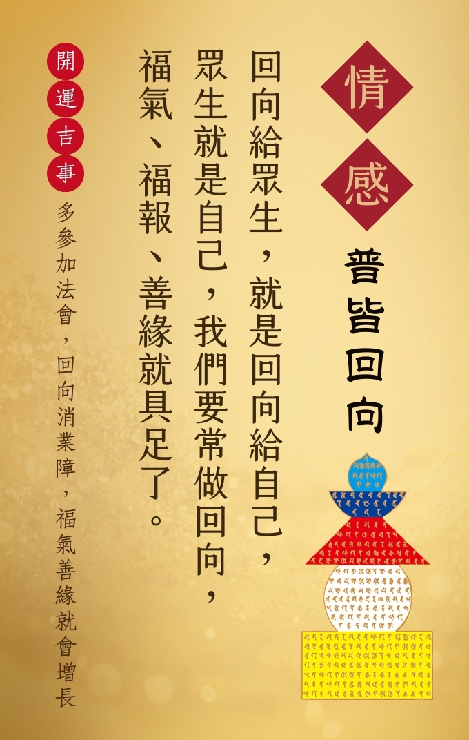 回向给众生,就是回向给自己,众生就是自己,我们要常做回向,福气、福报、善缘就具足了。