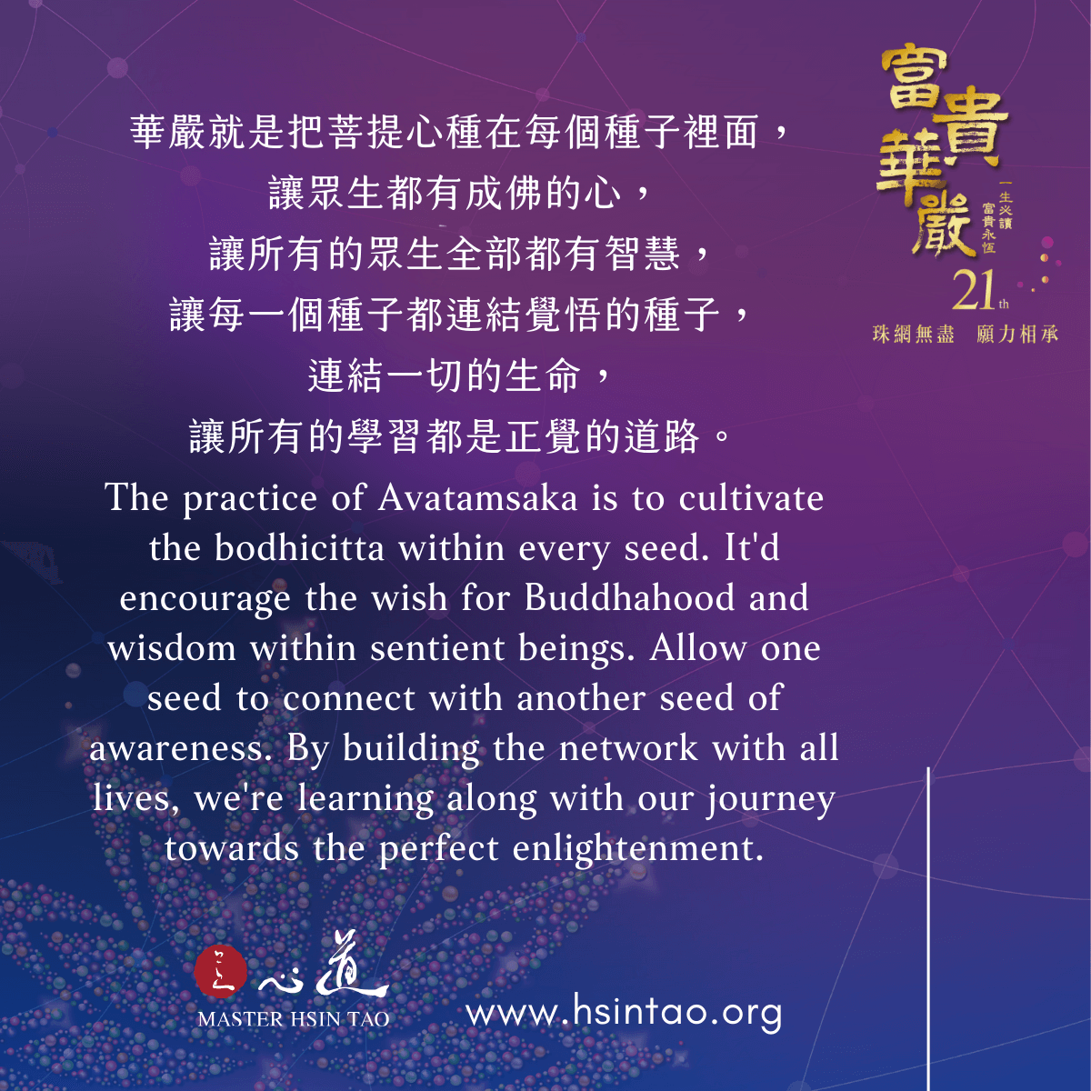 華嚴就是把菩提心種在每個種子裡面,讓眾生都有成佛的心,讓所有的眾生全部都有智慧,讓每一個種子都連結覺悟的種子,連結一切的生命,讓所有的學習都是正覺的道路。