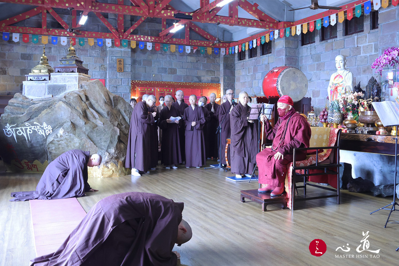 今天出家的男眾,法名叫「海達」,就是希望他的修行能夠達到究竟的正覺;另一位女眾法名叫「勝觀」,希望他觀什麼都是勝的,勝就是我們觀的東西都是成佛、成道的,不要觀不好的。