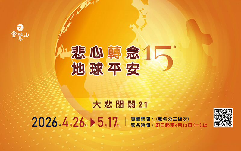 亂世之中,人心最需要的,是一處真實的依歸。觀世音菩薩「聞聲救苦」的願力,指引我們回到內心深處——唯有生起悲心,才能安頓自己,也庇護一切眾生。 靈鷲山開山和尚心道法師,幼年歷經烽火離亂,於十五歲時初聞觀音聖號,從此立下終身奉行觀音行願的誓願,一生持誦、弘揚〈大悲咒〉,從未間斷。 有感於天災人禍接連不斷,末日預言令世人惶惑難安,心道法師於2012年首度發起「百萬大悲咒21日願力閉關」,廣邀四眾弟子齊聚無生道場,精進持誦《百萬遍大悲咒》。所有參與學員皆依《大悲心陀羅尼經》之教導,嚴持八關齋戒,以清淨身口意,凝聚遍布全球的善念,共同迴向地球平安。 此刻,誠摯邀請您把握這份殊勝因緣,走入21天的「大悲閉關」。讓每一聲咒音、每一念悲心,化為安定人心、護念世界的力量。與大眾同行,為自己,也為這片土地,共同發願。