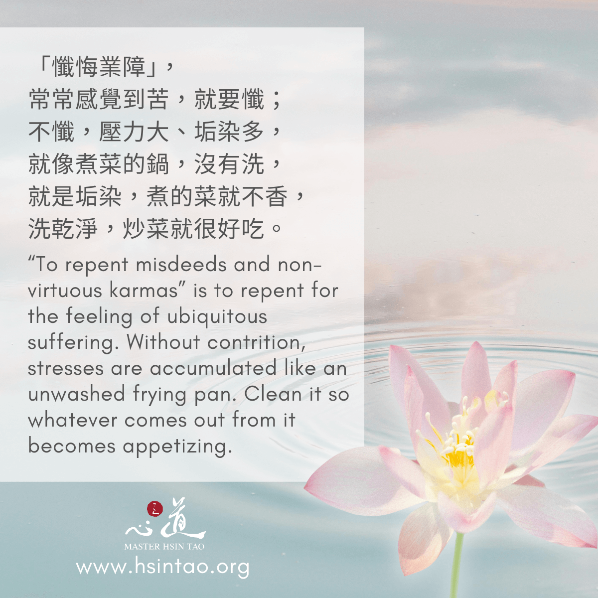 「忏悔业障」,常常感觉到苦,就要忏;不忏,压力大、垢染多,就像煮菜的锅,没有洗,就是垢染,煮的菜就不香,洗干净,炒菜就很好吃。