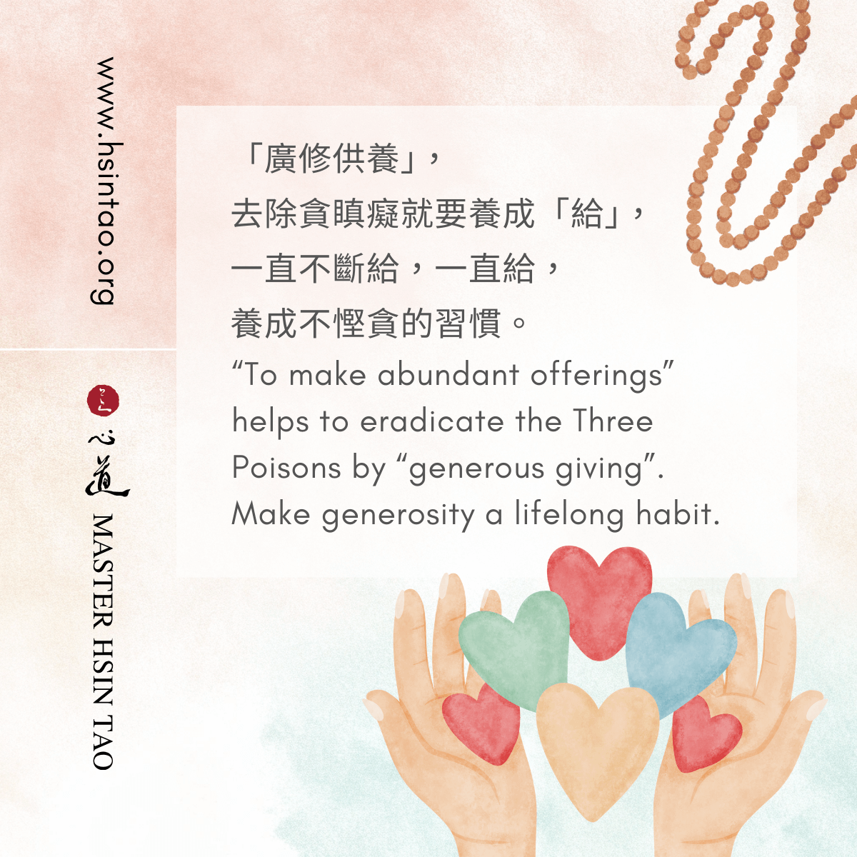 「广修供养」,去除贪瞋痴就要养成「给」,一直不断给,一直给,养成不悭贪的习惯。