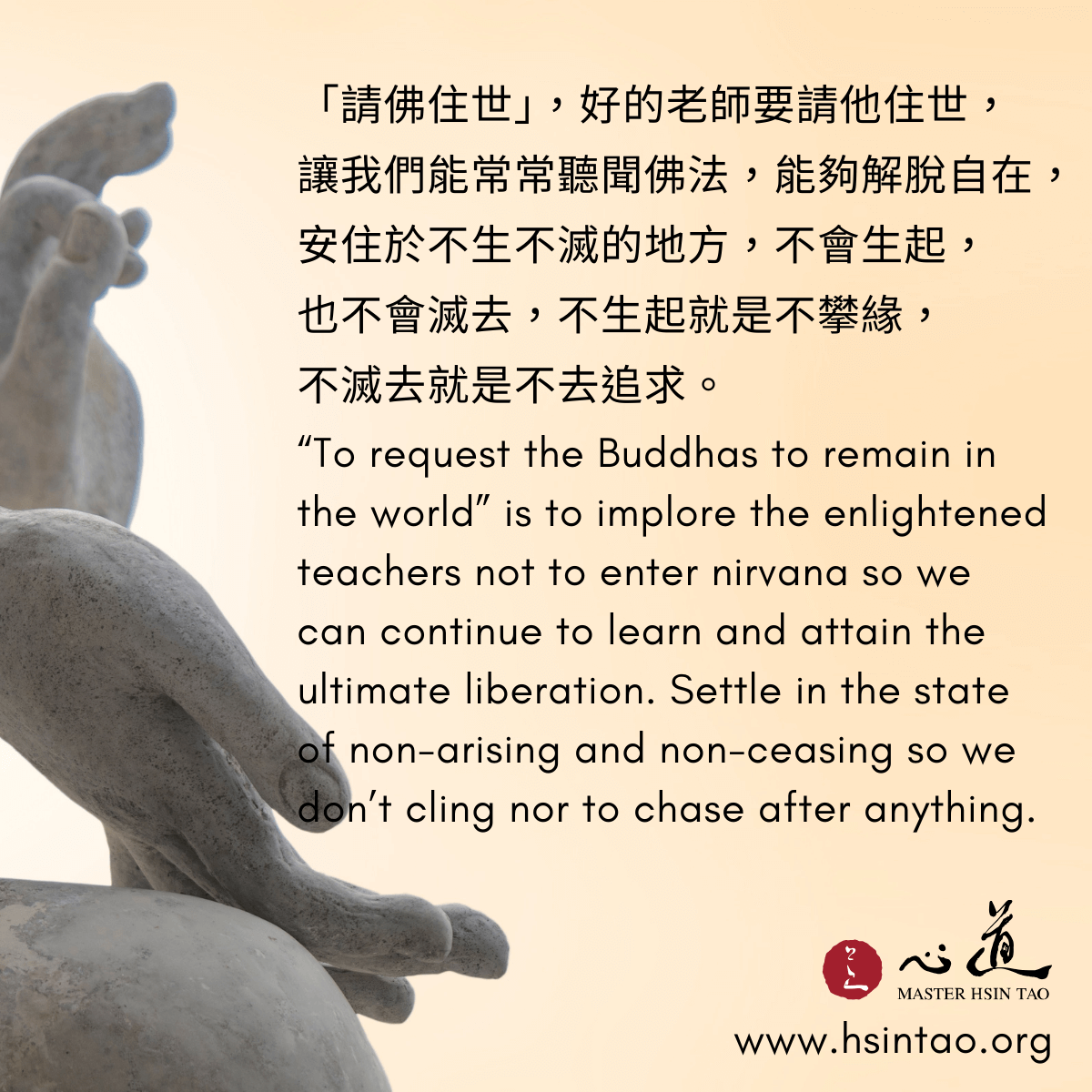 「請佛住世」,好的老師要請他住世,讓我們能常常聽聞佛法,能夠解脫自在,安住於不生不滅的地方,不會生起,也不會滅去,不生起就是不攀緣,不滅去就是不去追求。