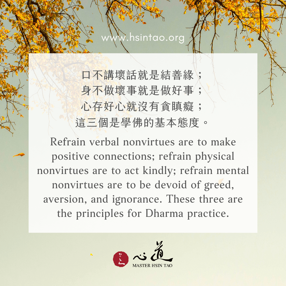 Refrain verbal nonvirtues are to make positive connections; refrain physical nonvirtues are to act kindly; refrain mental nonvirtues are to be devoid of greed, aversion, and ignorance. These three are the principles for Dharma practice.