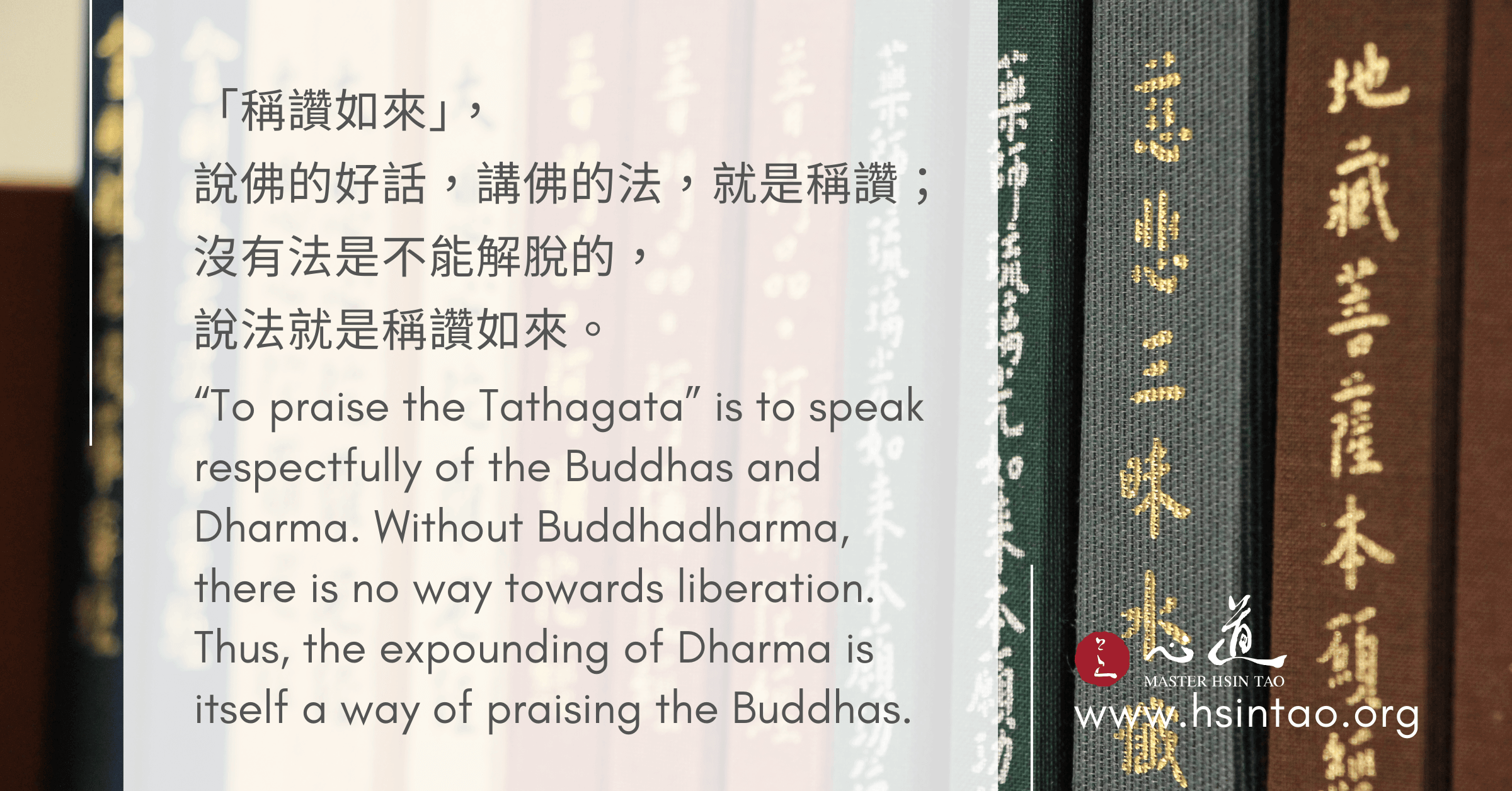 “To praise the Tathagata” is to speak respectfully of the Buddhas and Dharma. Without Buddhadharma, there is no way towards liberation. Thus, the expounding of Dharma is itself a way of praising the Buddhas.