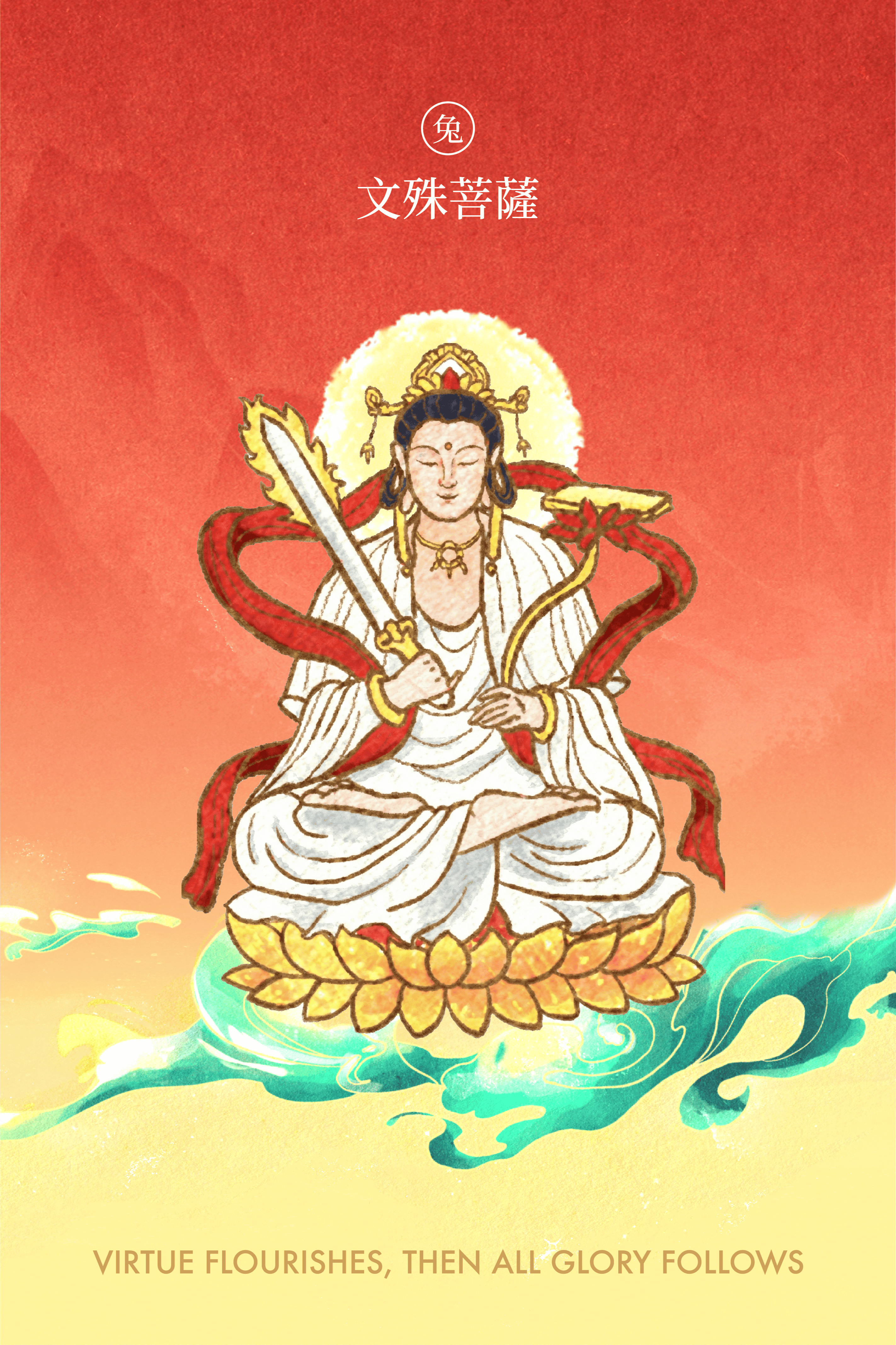 文殊菩薩的梵文名字意譯為「妙吉祥」,為四大菩薩之一,智慧第一,